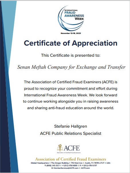شهادة شكر وتقدير دوليةوذلك تقديراً لجهود الشركة في توعية المجتمع بمخاطر وطرق الاحتيال في الاسبوع العالمي للتوعية ضد الاحتيال.